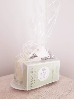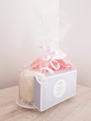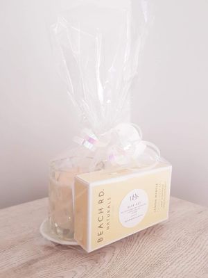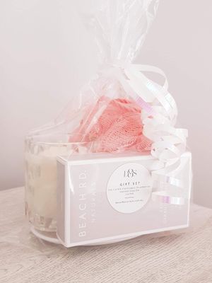 A compact gift set featuring the Diamond Soy Candle, Castile Soap Bar, soap plate, loofah all wrapped in gift bag with ribbon & tag for your personal message.